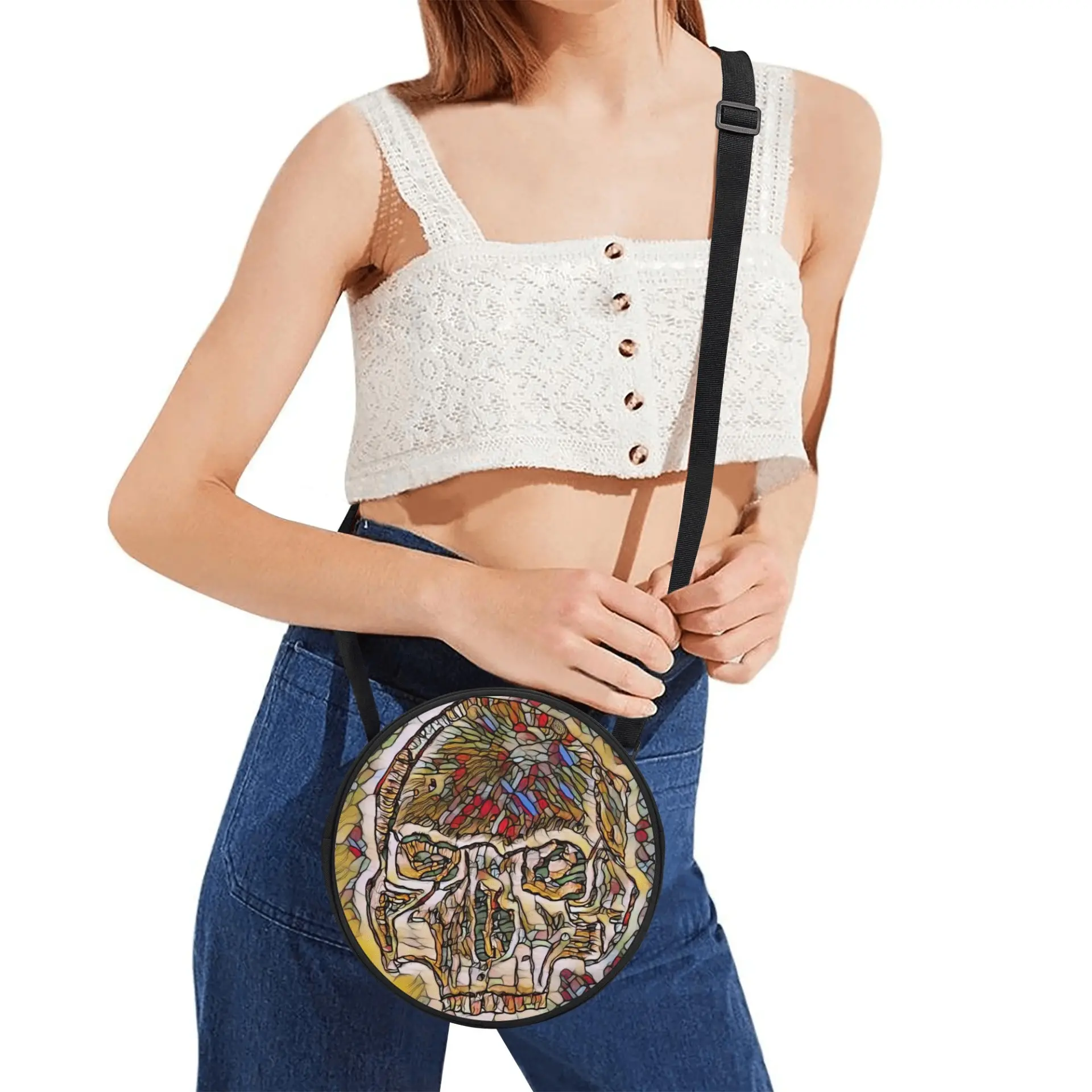 * Single zippered round closure and adjustable shoulder strap