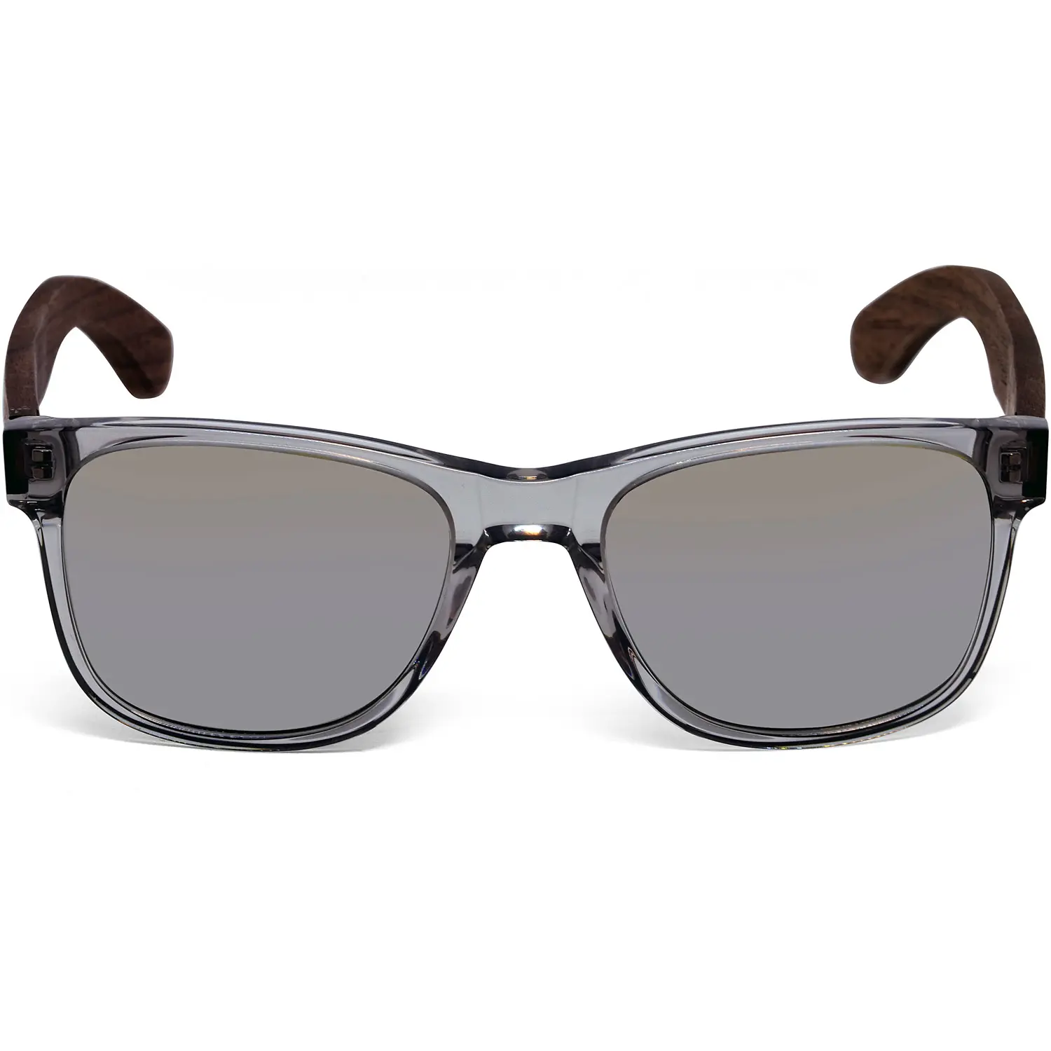 Walnut wood classic style sunglasses with semi-transparent grey frame and silver mirrored polarized lenses